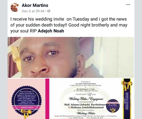 A young Nigerian man identified as Adejoh Noah passed away on December 6, a day after sending out his wedding invites to friends. Late Adejoh and his fiance Jemila Muhammed were set to wed on December 28, 2018, in Ankpa, Kogi State. May his soul rest in Peace. Meanwhile Adejoh’s friends took to Facebook to mourn him.