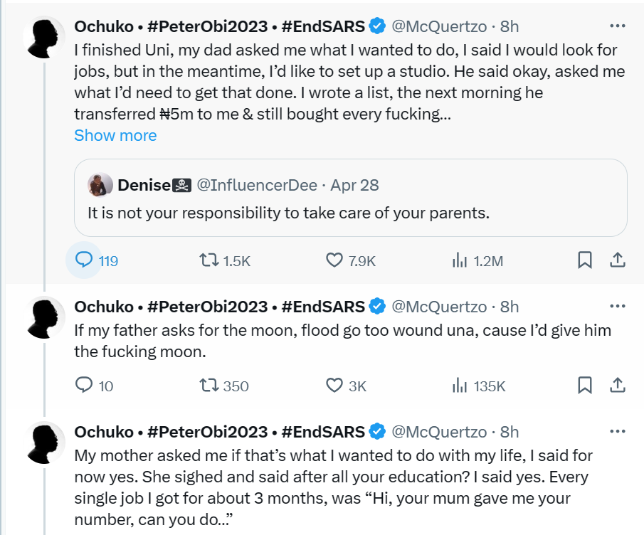 In tweets he shared, @McQuertzo, his father gave him money to set up the business he wanted after graduating from the university. He also revealed that his mother connected him to all the top clients he got after he started the business.