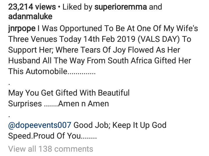 He shared the video saying a nigerian man in south Africa decided to suprise his wife on valentine day as he gifted her a new toyota Venza as her own valentine gift all the way from south Africa.