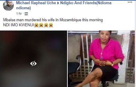 A Nigerian Man from MBaise Imo State has murdered his wife this morning in Mozambique According to Facebook User.