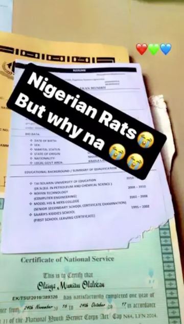 Nigerian Man Laments As Rats Destroy His Certificates After 8 years Of Job Hunting