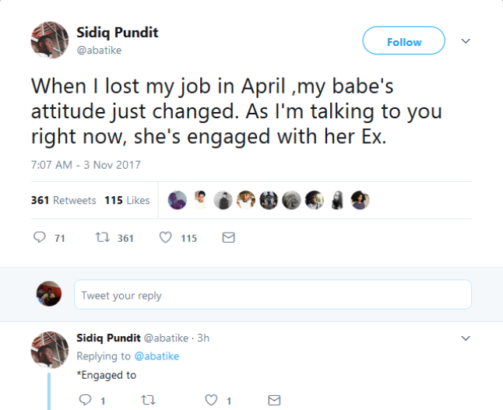 A Nigerian man and Twitter user, @abatike has narrated how his then girlfriend’s attitude changed after he lost his job in April. He further revealed that he lost her to her ex-boyfriend.According to him, the two are now engaged as he dished out advice to followers in subsequent tweet