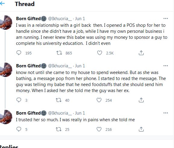 According to the lad identified as @Ikhuoria__ on Twitter said he set up a POS business for his girlfriend since she was unemployed but unknown to him, she was using the proceeds to sponsor the other guy to complete his education.