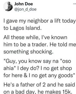 “A Nigerian man took to Twitter to disclose that his neighbour that has no shop or goods makes nothing less than Fifteen Thousand Naira in Lagos Island Market.