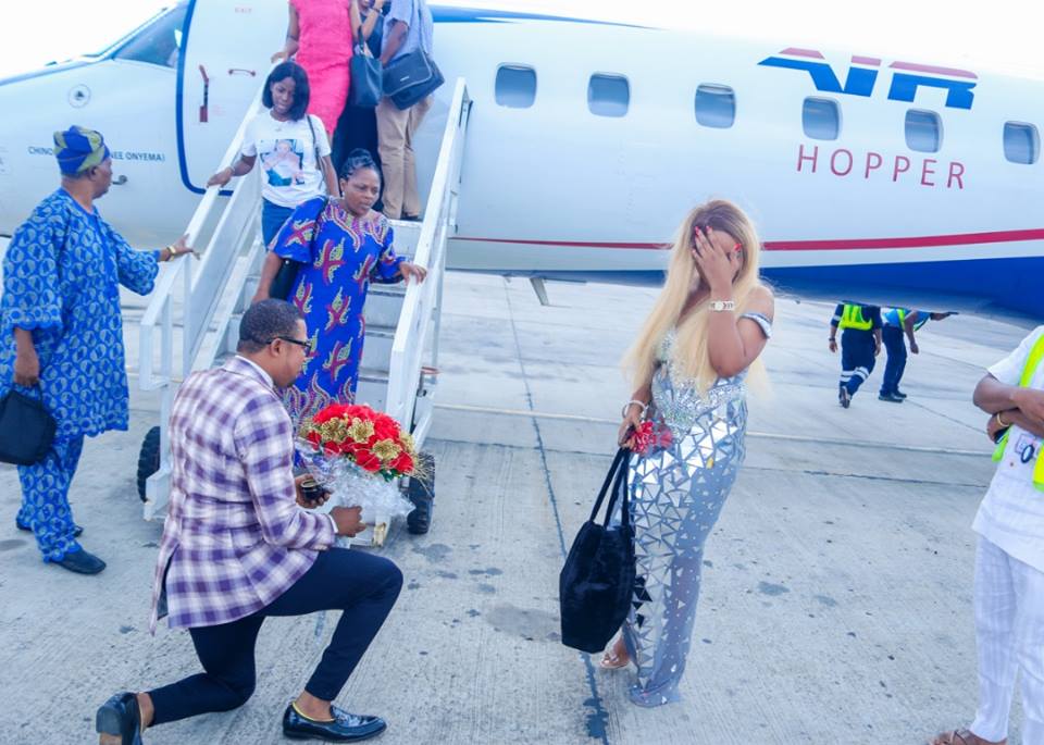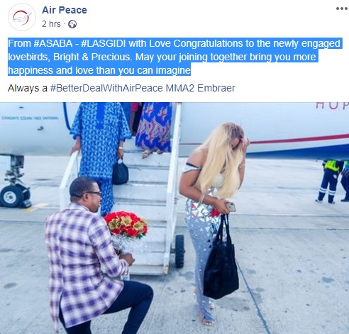 A Nigerian man identified as Bright reportedly proposed to his girlfriend, Precious at Lagos and their photos are already going viral on social media. Air Peace who shared photos of the Nigerian man who proposed to his girlfriend at the Lagos airport on the official Facebook page, wrote;