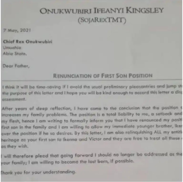 According to Ifeanyi, in a letter dated May 7th, revealed he is willing to be the last born of the family as being the first son of the family is a thorn in his flesh, adding that his immediate younger brother should take the position.