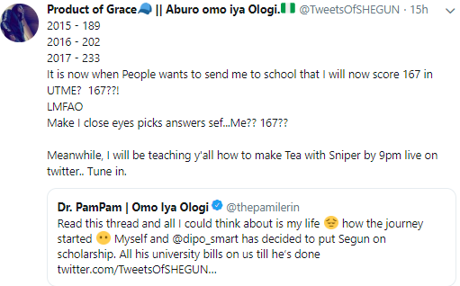 Earlier in the day, Segun had posted tweets describing how sad he was at scoring a low mark in his JAMB examination. According to Segun, there was no way he could have scored such a low mark. He then suggested that he will be trying to commit suicide by 9pm on Sunday night.