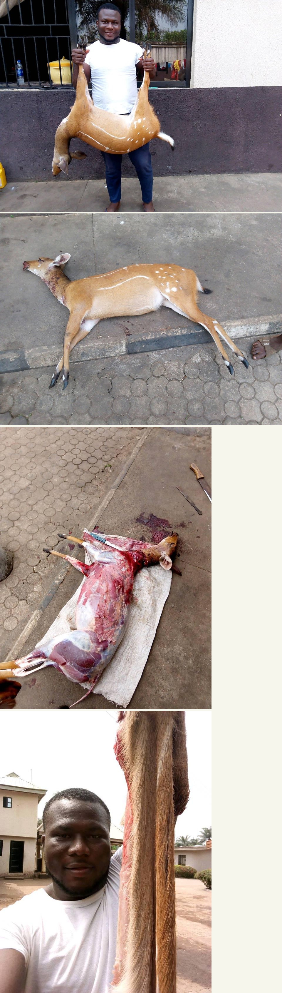 A Nigerian man,Uchenna Irechukwu was so elated after catching an antelope during a hunting expedition in Owerri, Imo state. According to the graduate of Enugu State University of Science and Technology, he caught the antelope while hunting last night before skinning the dead animal and butchering it in preparation for pepper soup. See pictures below;