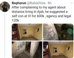 According to him, he was searching for accommodation in Lagos before he came across the poorly maintained house he was shown by an agent at exorbitant price.