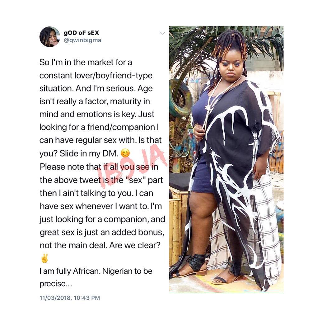 Nigerian Media Personality Initiates Search For Someone To Have Regular Sex With