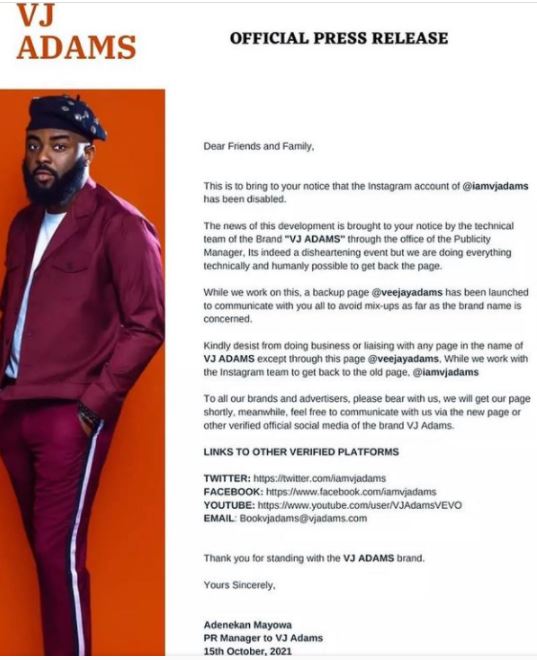 VJ Adams who has now confirmed that his account was disable, urged everyone to desist from doing business or liaising with any page with his name.