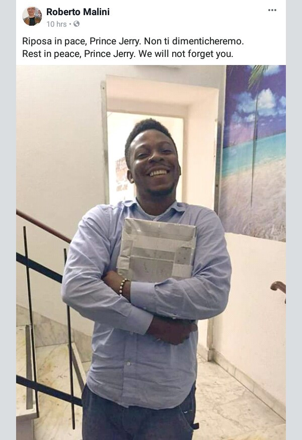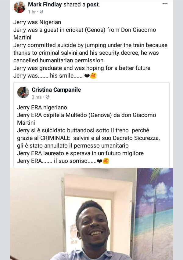 A 25-year-old Nigerian man, Prince Jerry, committed suicide on January 28 2019, by jumping under a train in Tortona, Genoa, Italy after his request for a residency permit for humanitarian reasons was rejected, Monsignor Giacomo Martino, the head of association Migrants, said on Thursday.