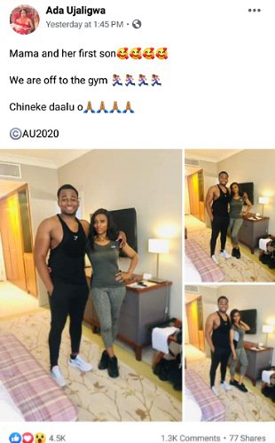 The young lady identified as Ada Ujaligwa took to Facebook some days ago and shared mind blowing photos of herself and a fully grown man looking like her husband and introduced him as his “first son”.