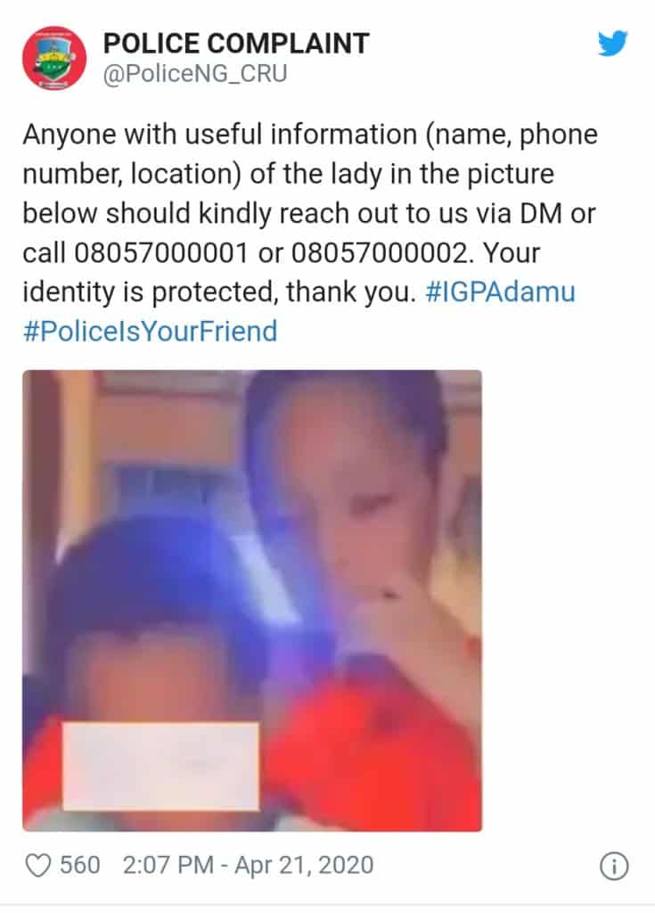 Police shared on their social media page: “Anyone with useful information (name, phone number, location) of the lady in the picture below should kindly reach out to us via DM or call 08057000001 or 08057000002. Your identity is protected, thank you. #IGPAdamu #PoliceIsYourFriend”