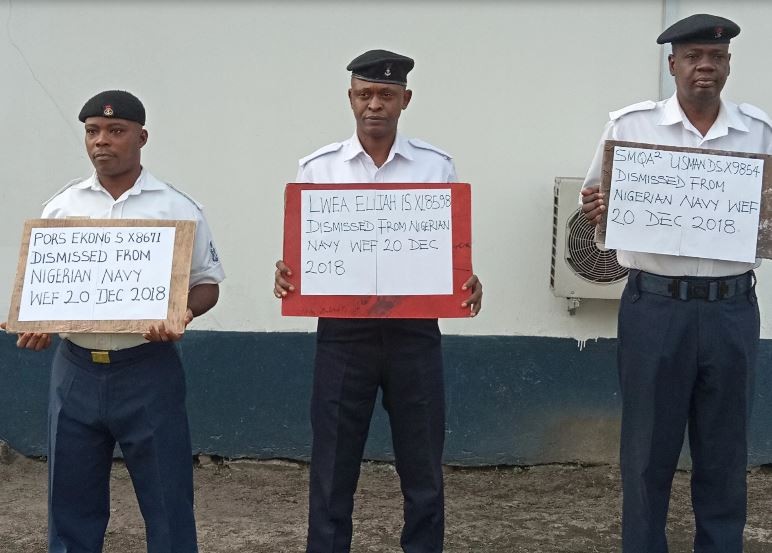The dismissed Naval personnel include: Petty Officer Ekong Samuel, Leading Seaman Elijah Sagwada and Seaman Usman Shuaibu. The dismissed Naval personnel were on guard duty where they were arrested in June this year over alleged theft of properties confiscated at a Ship Yard in Warri.