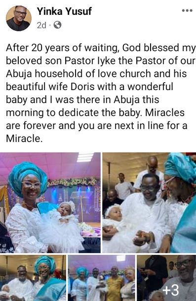 “After 20 years of waiting, God blessed my beloved son Pastor Iyke the Pastor of our Abuja household of love church and his beautiful wife Doris with a wonderful baby and I was there in Abuja this morning to dedicate the baby. Miracles are forever and you are next in line for a Miracle,” he wrote.