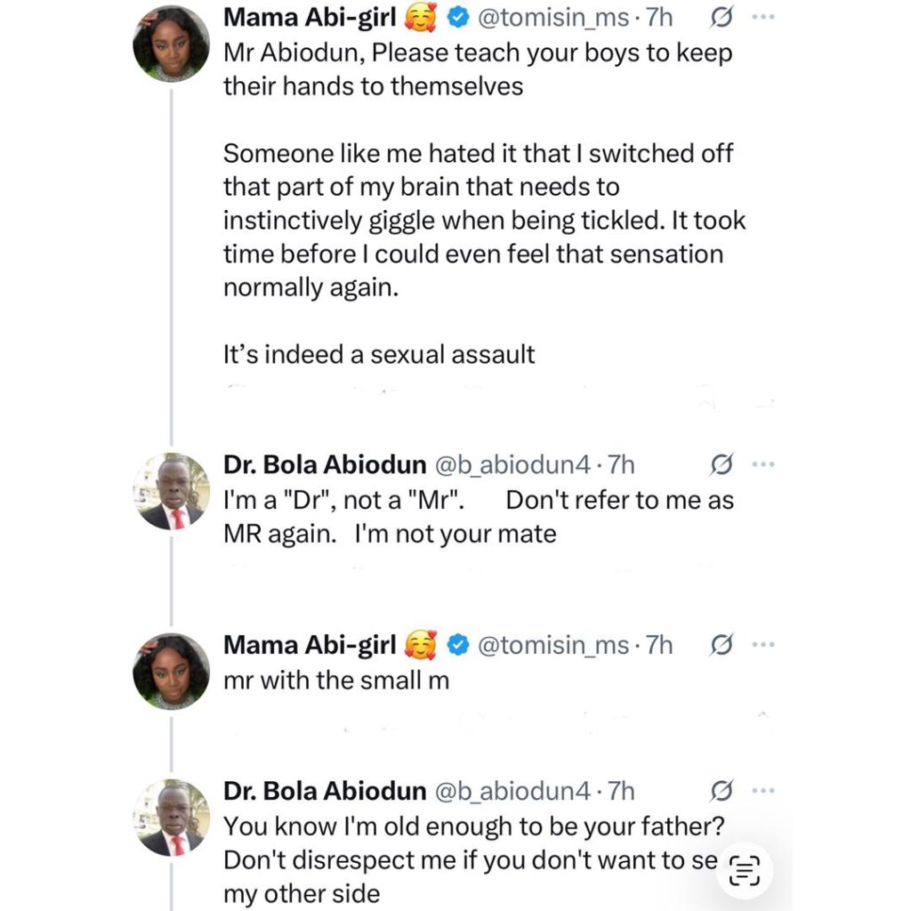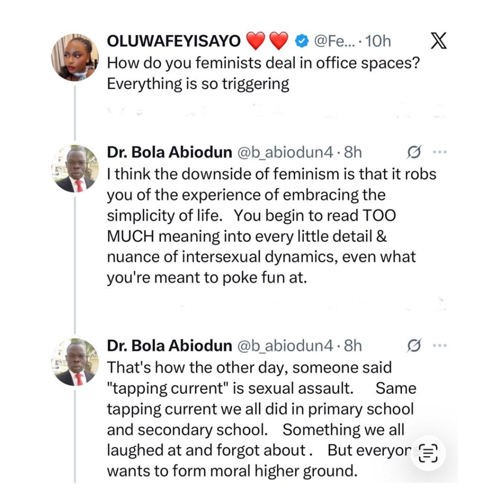 Tomisin saw his comment and immediately pointed out that tapping of current is inappropriate and that Abiodun should endeavour to teach his boys to keep their hands to themselves as ‘’tapping of current” is indeed sexual harassment. She said that she experienced it while growing up and that the trauma lived with her for so long.