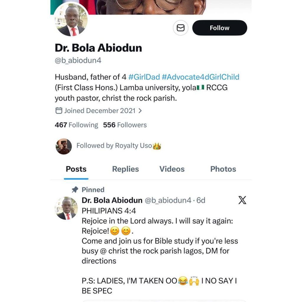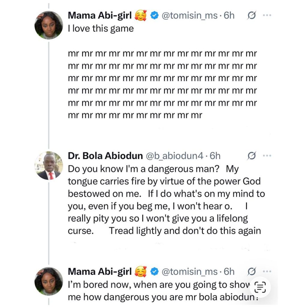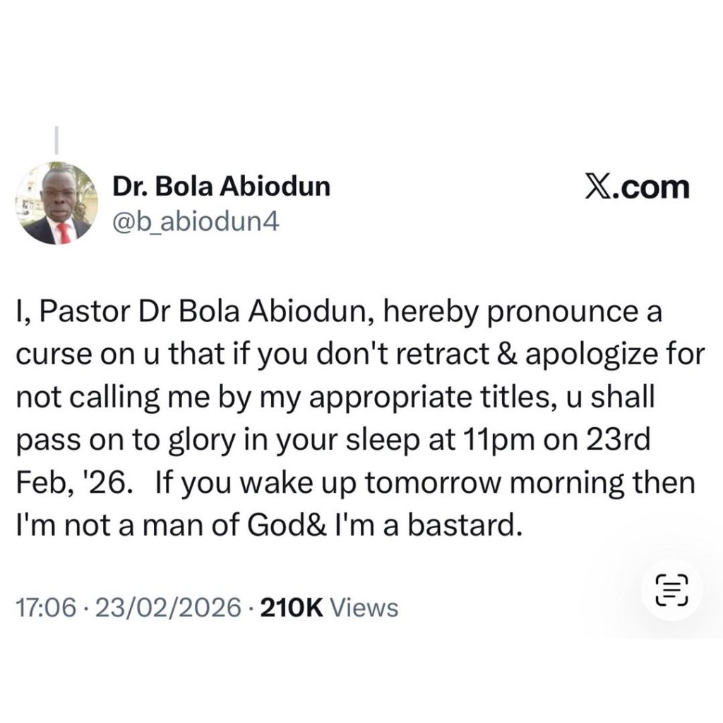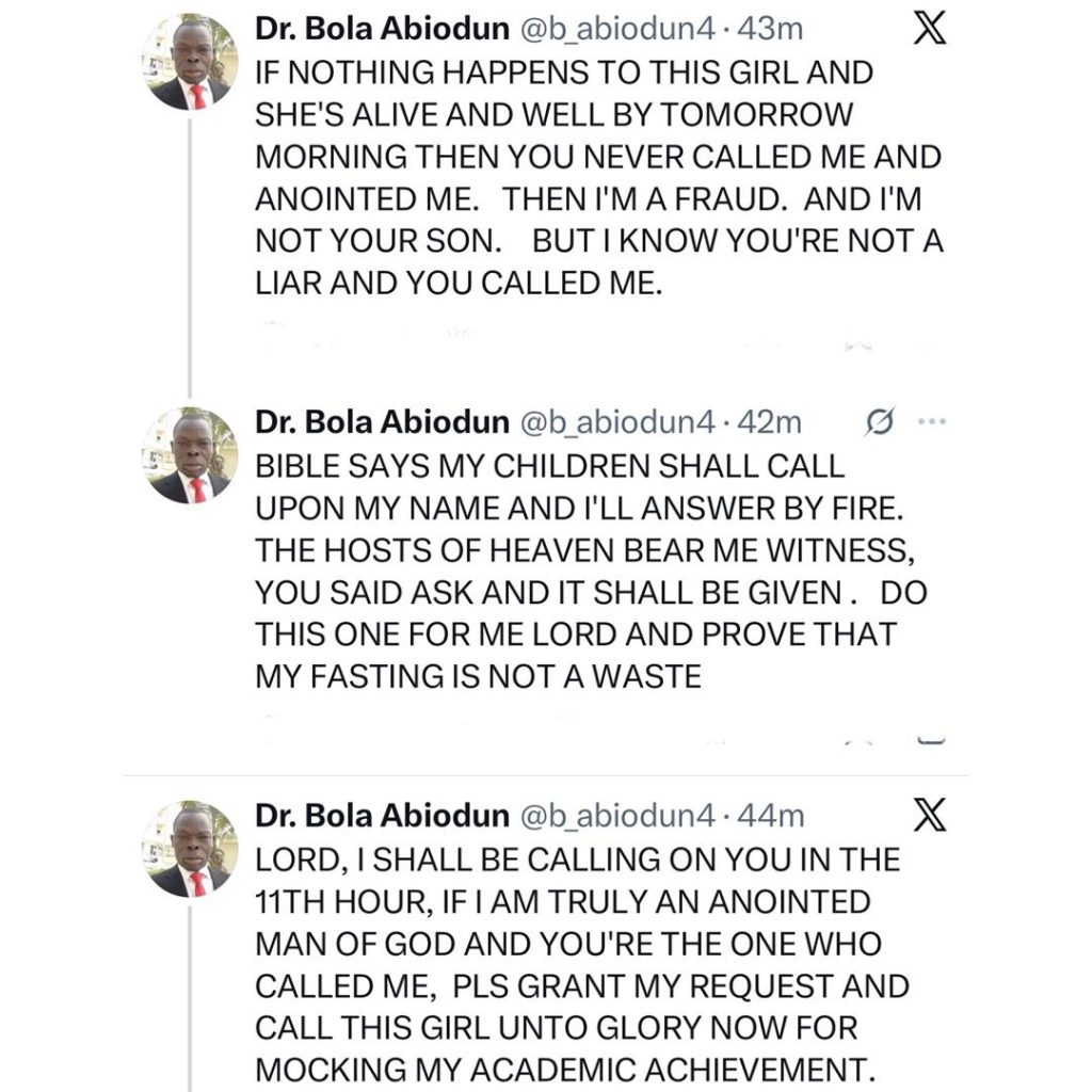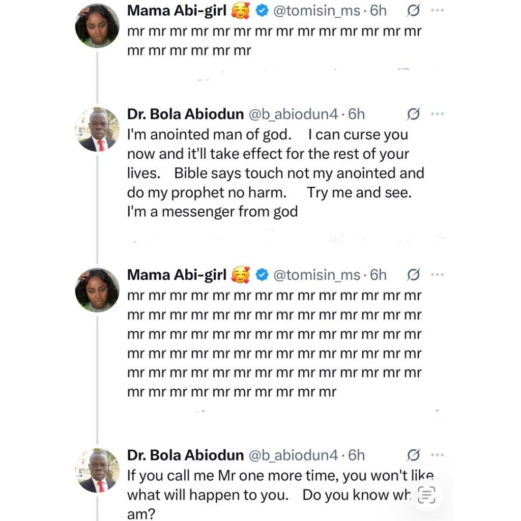 Nigerian Twitter witnessed drama last night, February 23, after a Youth Pastor, Dr Bola Abiodun, rained curses on a Health and Safety professional identified as Tomisin for refusing to address him with his professional title, Dr.