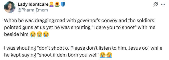 “When he was dragging road with governor’s convoy and the soldiers pointed guns at us yet he was shouting “I dare you to shoot” with me beside him. I was shouting “don’t shoot o. Please don’t listen to him, Jesus oo” while he kept saying “shoot if dem born you well,” she wrote.
