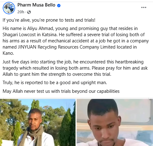 A Nigerian pharmacist, Musa Bello, has shared the story of a young man from Katsina State, Aliyu Ahmad, who lost both arms in a tragic work accident five days after employment.