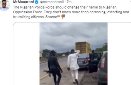 Reacting to the video, Debo, an activist, tweeted: “The Nigerian Police Force should change their name to Nigerian Oppression Force. They don’t know more than harassing, extorting and brutalizing citizens. Shame!!!”