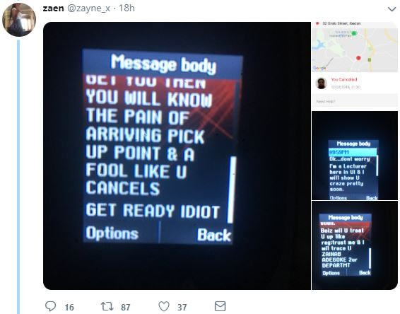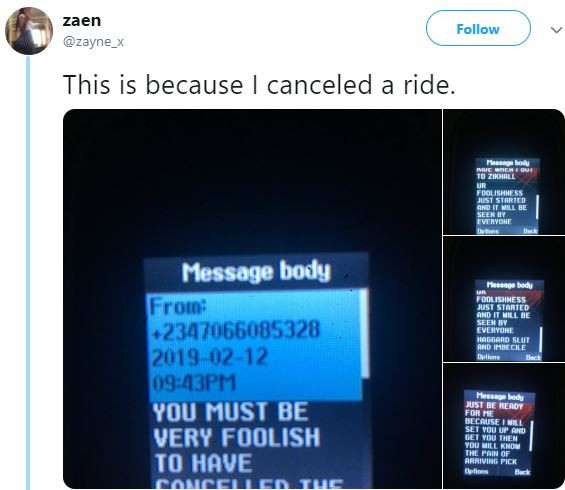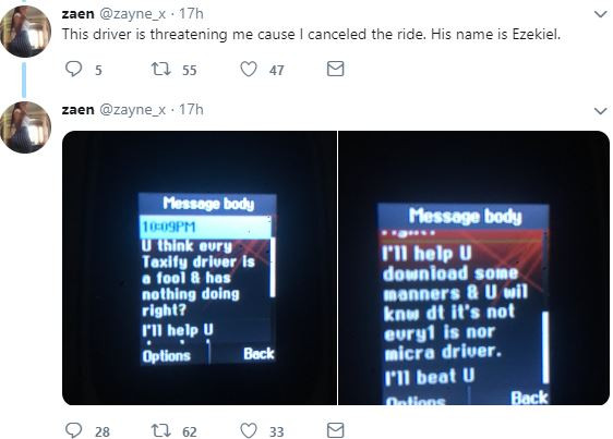 A Nigerian lady on Twitter just shared screenshots of multiple text messages she received from a Taxify driver identified as ‘Ezekiel’ who threatened to beat her up because she canceled a ride.
