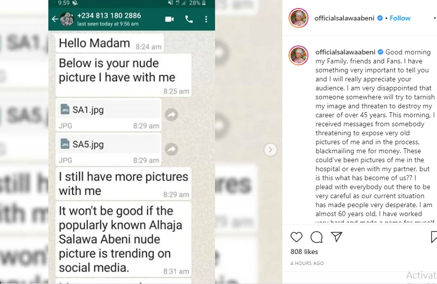 Sharing screenshots of the nudes and the conversation she had with her blackmailer, Salawa revealed that the man who identified himself as Jason and a resident of Osun state is threatening to tarnish her image and destroy her career of over 45 years.