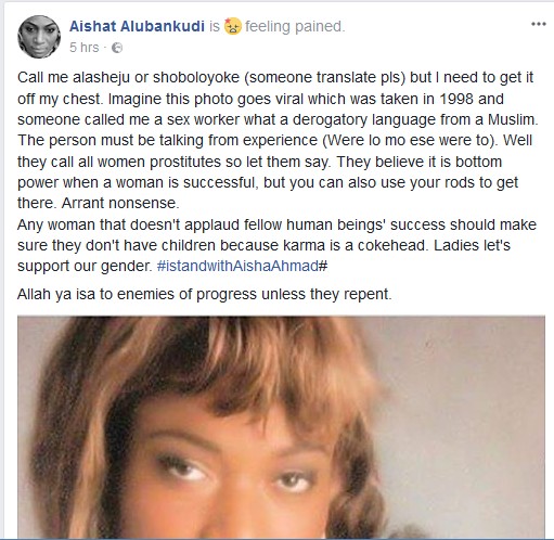 Well they call all women prostitutes so let them say. They believe it is bottom power when a woman is successful, but you can also use your rods to get there. Arrant nonsense. Any woman that doesn’t applaud fellow human beings’ success should make sure they don’t have children because karma is a cokehead. Ladies let’s support our gender. #istandwithAishaAhmad#