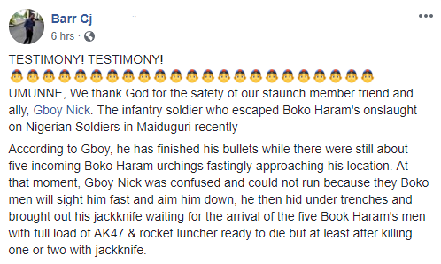 According to Barrister C.J, the soldier is back and has promised to show some love to his Facebook friends as a way of appreciating his survival.