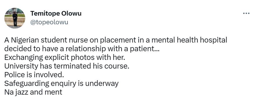 “A Nigerian student nurse on placement in a mental health hospital decided to have a relationship with a patient… Exchanging explicit photos with her. University has terminated his course. Police is involved. Safeguarding enquiry is underway Na jazz and ment”