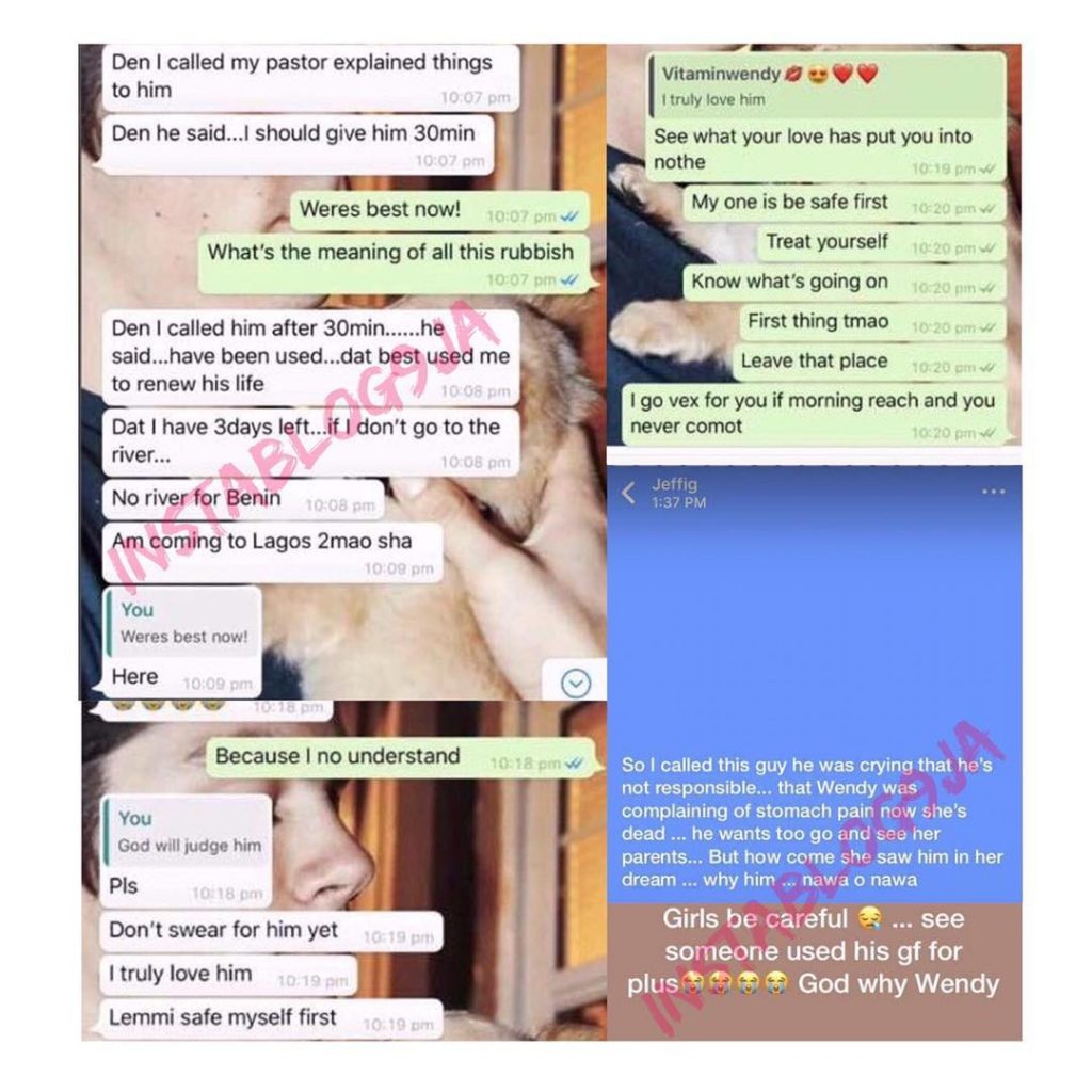 According to a recent chat she had with a friend before her death, she said she dreamt that she was bleeding and was told, in the dream, that her boyfriend had used her for ritual.