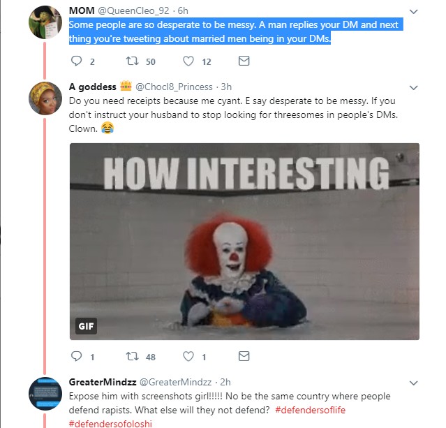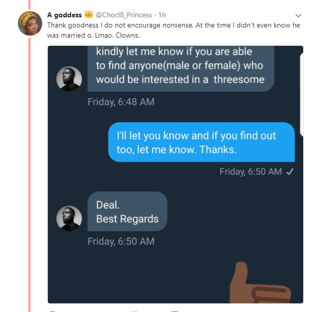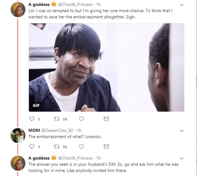 The banter took off after @chocl8_princess replied to a tweet of the Nigerian man’s wife which read ‘Some people are so desperate to be messy. A man replies your DM and next thing you’re tweeting about married men being in your DMs.’