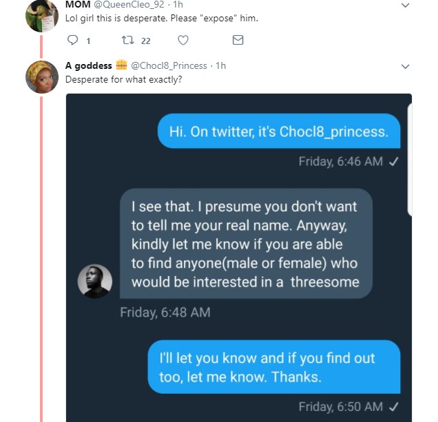 A mild drama ensued on a Twitter thread of a Nigerian lady @chocl8_princess, who disclosed how a Nigerian man stormed her DM to ask for a party.