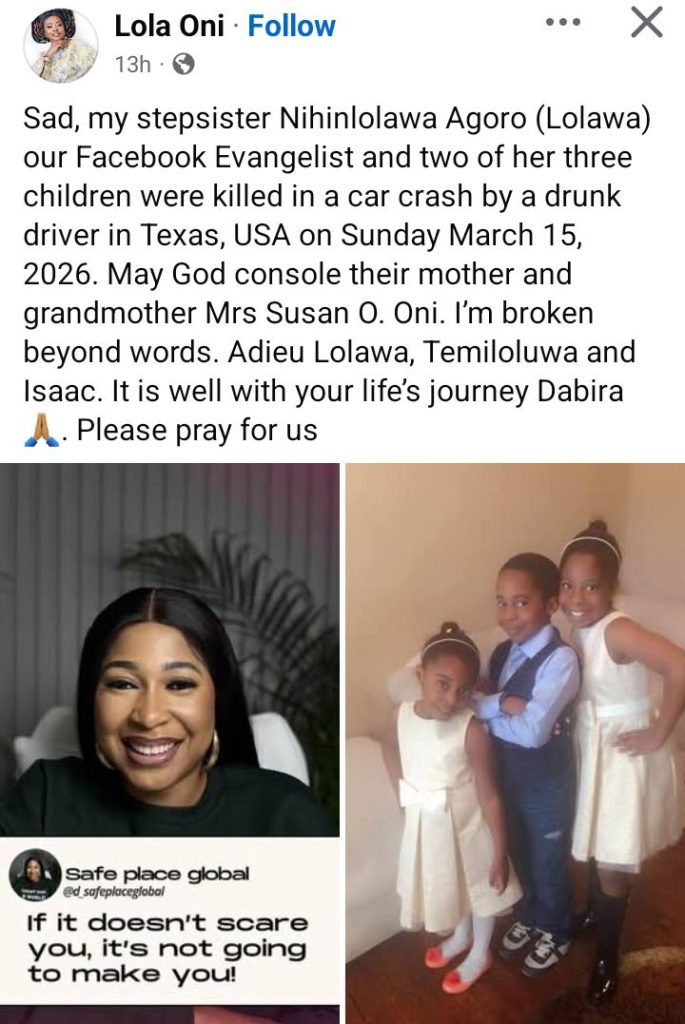 A Nigerian woman, Nihinlolawa Agoro and two of her children, Temiloluwa and Isaac, were killed in a deadly crash in Texas, United States with multiple other people rushed to the hospital for injuries.