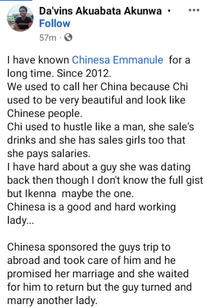 Sharing further details on the issue, one Davins Akuabata Akunwa, who claims to have known Chinesa since 2012, alleged that she indeed sponsored one man abroad and took care of him until he settled down.