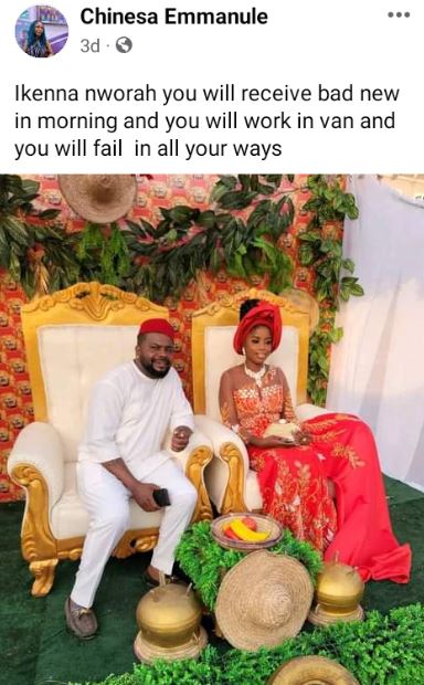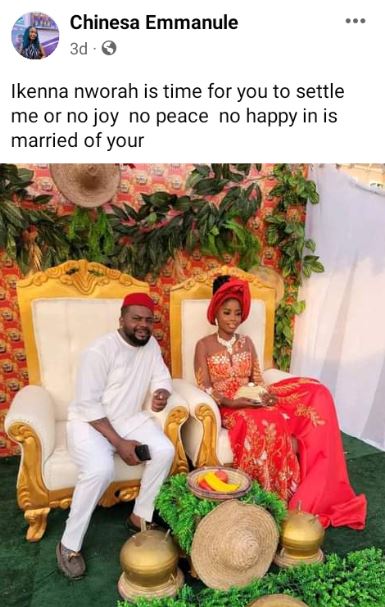 Taking to her Facebook page, Chinesa asked Ikenna to come and ?settle her? or there will be no peace and happiness in his marriage.