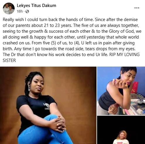 “Really wish I could turn back the hands of time. Since the demise of our parents about 21 to 23 years. The five of us are always together, seeing to the growth & success of each other & to the Glory of God, we are all doing well & happy for each other, until yesterday that the whole world crashed on us. From five (5) of us, to (4), U left us in pain after giving birth. Any time I go towards the road side, tears drops from my eyes. The Dr that don’t know his work decides to end Ur life. RIP MY LOVING SISTER.”