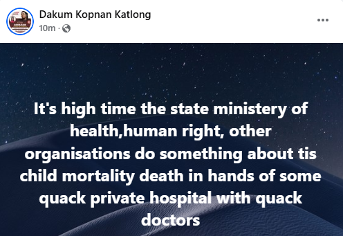 One family member, Dakum Kopnam Katlong, in a Facebook post on Thursday, March 6, 2025, called on the state government to check the activities of quack doctors and hospitals.