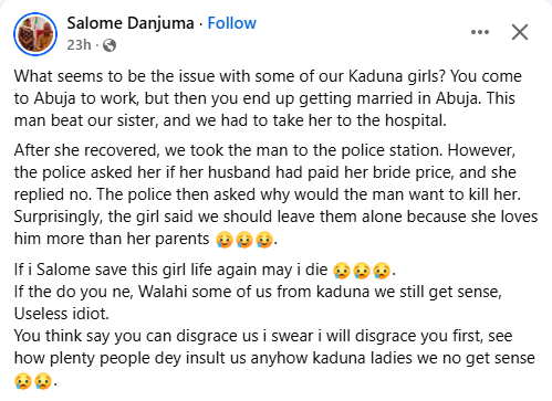 “What seems to be the issue with some of our Kaduna girls? You come to Abuja to work, but then you end up getting married in Abuja. This man beat our sister, and we had to take her to the hospital,” she wrote.