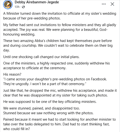 “A Minister turned down the invitation to officiate at my sister’s wedding because of her pre-wedding photos. My father had sent out invitations to fellow ministers and they all gladly accepted. The joy was real. We were planning for a beautiful, God-honouring wedding,” she wrote.