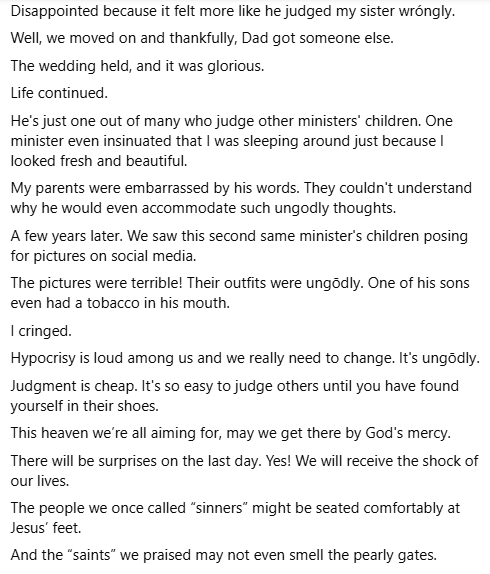 The wedding held, and it was glorious. Life continued. He’s just one out of many who judge other ministers’ children. One minister even insinuated that I was sleeping around just because I looked fresh and beautiful.