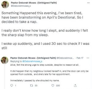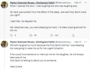 Deborah Moses, a Nigerian woman, has taken to her Twitter handle to share the story of how the “Holyspirit” woke her up with a ‘slap’.