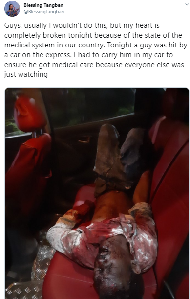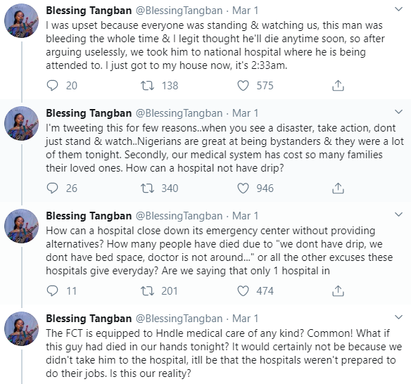 A Nigerian lady, Blessing Tangban, has shared the sad experience she had at different hospitals she rushed a man hit by a car in Abuja yesterday March 1st.