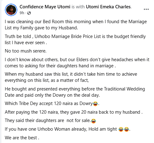 “I was cleaning our bedroom this morning when I found the Marriage List my Family gave to my Husband. Truth be told, Urhobo Marriage Bride Price List is the most budget friendly list I have ever seen,” she wrote in a Facebook post on Thursday.