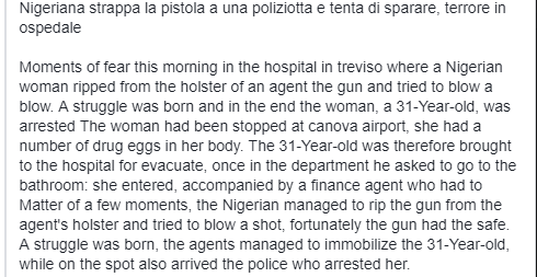 According to reports, the Nigerian woman who was apprehended at the Canova Airport in Trevisto, had allegedly ingested drugs and was taken by the officials to the hospital in a bid to evacuate them.
