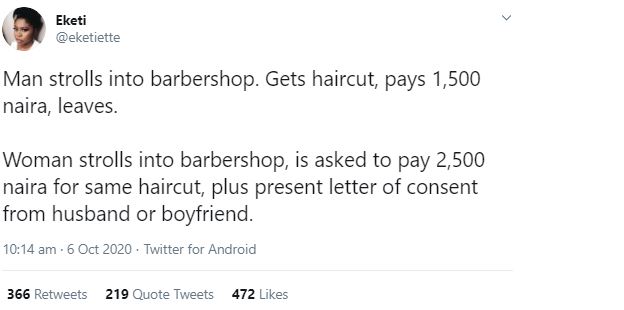The conversation started after Twitter user @eketiette wrote: “Man strolls into barbershop. Gets haircut, pays 1,500 naira, leaves. Woman strolls into barbershop, is asked to pay 2,500 naira for same haircut, plus present letter of consent from husband or boyfriend.