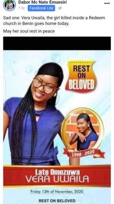 Miss Vera Uwaila Omozuwa will be buried today. Recall that she was brutally raped and murdered in Redeemed Christian Church of God in Benin, Edo state. The brutal rape and murder of Uwa Omozuwa, has been condemned by Nigerians all over the country.