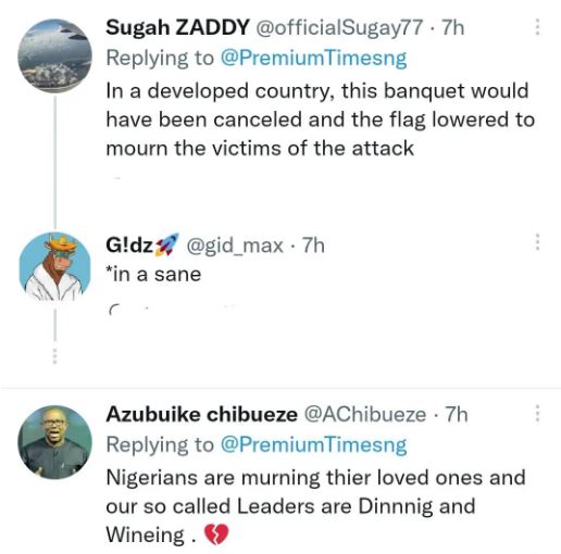 Some Nigerians on Twitter opined that it was insensitive to host a dinner when citizens were murdered inside a church, while some said the meeting must be have been fixed prior to the unfortunately incident, hence could not be cancelled.  Others stated that the dinner should have been cancelled.
