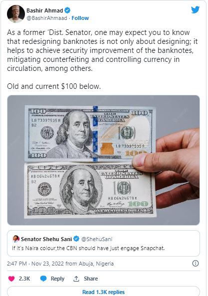 Reacting to the former lawmaker’s criticism via his verified Twitter page, Bashir said: “As a former ‘Dist. Senator, one may expect you to know that redesigning banknotes is not only about designing; it helps to achieve security improvement of the banknotes, mitigating counterfeiting and controlling currency in circulation, among others.
