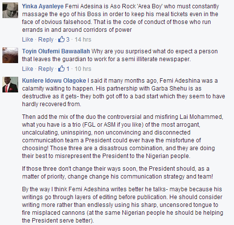 Nigerians on Facebook called out Presidential spokesperson, Femi Adesina, for referring to one of his critics, US Based Professor of English, Pius Adessanmi, as a Chief Wailer. Adesanmi shared a post on his Facebook page condemning Adesina’s seeming distance from Nigerians whom he is meant to be feeding with information about President Buhari.